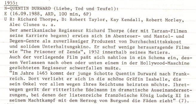 Die IMDb-Nutzer:innen sehen die drei oben erwähnten Ritterfilme mit Taylor als mittelprächtig an, 6,5/10 (der noch erfolgreiche „Ivanhoe“, 6,2/10 „Ritter der Tafelrunde“ und 6,3/10 für „Liebe, Tod und Teufel“ bilden ein enges Spektrum, das auch typisch für die Regiearbeiten des Routiniers Richard Thorpe ist. Dieser hatte seine Karriere übrigens nicht mit Tarzan-Filmen begonnen, sondern war einer der vielen On-the-Job-Lernenden-Routiniers in Hollywood, die in der Stummfilmzeit mit ihrer Arbeit anfingen, hatte allerdings tatsächlich bei vier Tarzan-Filmen mit Johny Weissmüller in den Jahren 1936 bis 1942 Regie geführt und wurde u. a. durch diese Arbeiten bekannt. Sein bester Film gemäß IMDb war aber seine einmalige Arbeit an einer ikonischen weiteren Reihe von MGM-Kinofilmen: „Der dünne Mann kehrt heim“ (1945, 7,3/10).