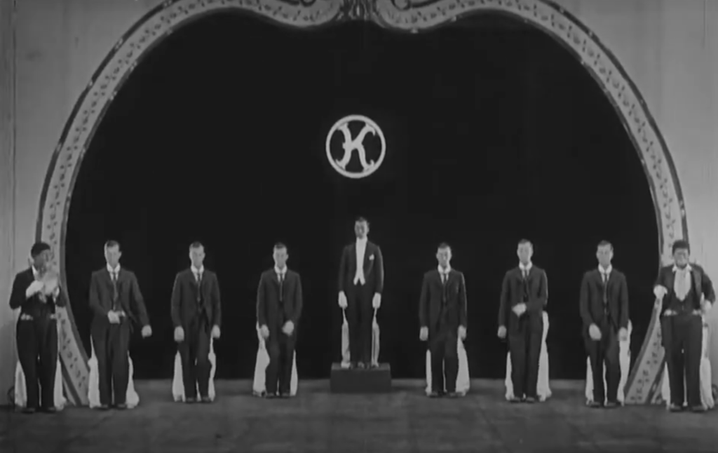 Wir mussten sofort an „Adel verpflichtet“ denken, als wir Buster Keaton in vielfacher Verkleidung als Männer und Frauen sahen, und sie sind alle gelungen, nicht nur bezüglich der Kostüme, sondern auch bezüglich des Verhaltens. Und dann sieht man ihn bis zu dreimal in einem Bild als Musiker und später in noch größerer Zahl auf der Bühne. Sogar das vermutlich erste Steptanzduo der Filmgeschichte hat er wohl alleine gespielt, was ihn ehrt, auch wenn die Schritte nicht auf dem Niveau von Fred Astaire sind. Das Verblüffende, das sieht man auch bei den Zwillingsschwestern deutlich: Selbst Filme, die viel später entstanden, haben die Übergänge zwischen den montierten Teilbildern nicht so gut hinbekommen. Und es sind ja nicht einfach Kopien, Buster bewegt jede der Figuren so, dass sie auf perfekte Weise parallel agieren, aber unterschiedliche Körperhaltungen einnehmen. Besonders beim Spielen der Instrumente fällt das auf. Sicher gibt es einen Trick, der schon 1921 funktioniert haben muss, aber wir sind schon ziemlich beeindruckt, weil wir uns nicht so recht vorstellen können, wie er diese virtuose Form von Synchronität hinbekommen hat.