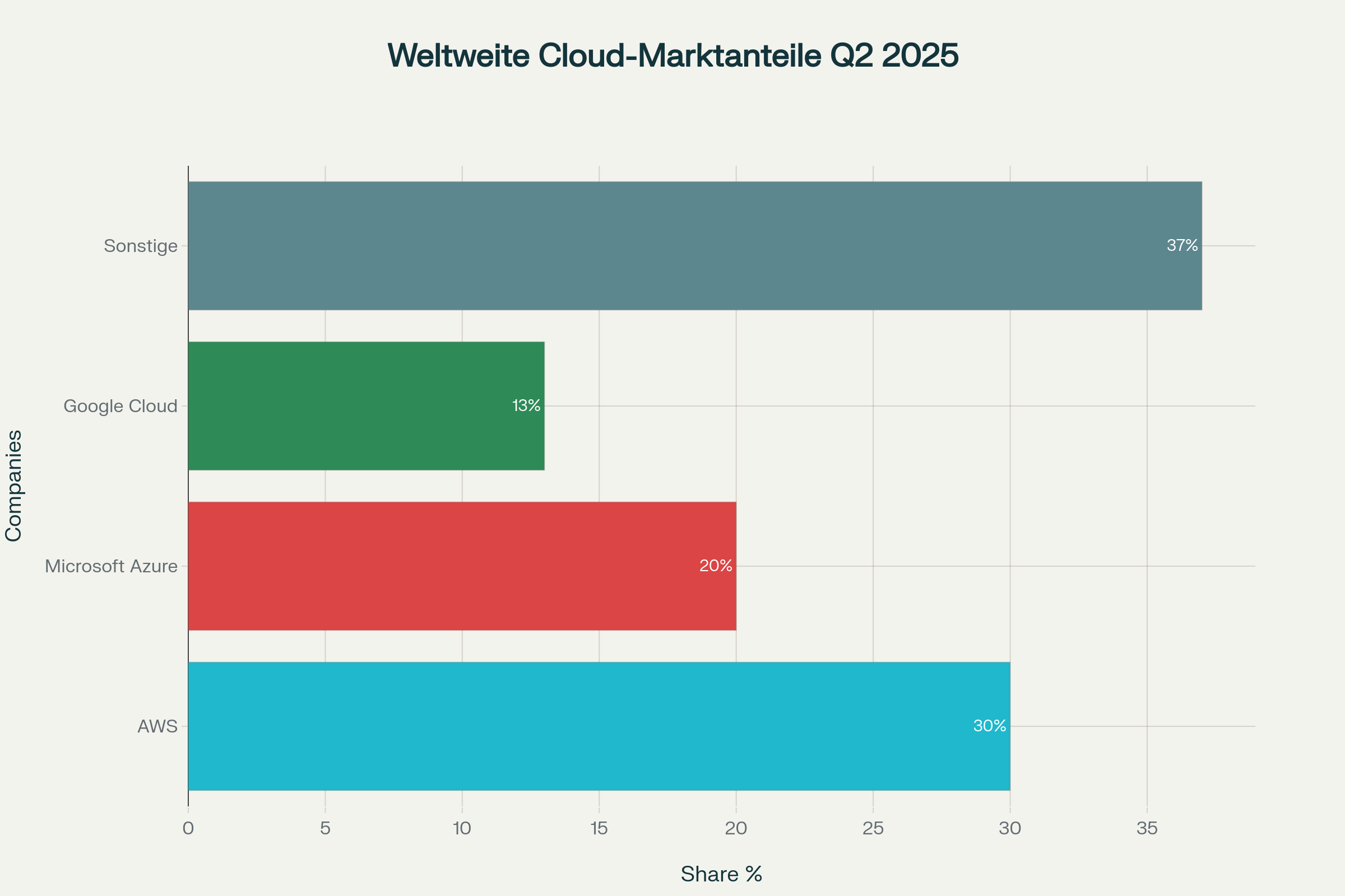 Die aktuellen Daten aus dem zweiten Quartal 2025 zeigen eine deutliche Konzentration im globalen Cloud-Infrastruktur-Markt. Amazon Web Services (AWS) führt mit einem Marktanteil von 30 Prozent, gefolgt von Microsoft Azure mit 20 Prozent und Google Cloud mit 13 Prozent. Zusammen kontrollieren diese drei US-amerikanischen Unternehmen 63 Prozent des weltweiten Cloud-Marktes, während alle anderen Anbieter sich die verbleibenden 37 Prozent teilen müssen.statista