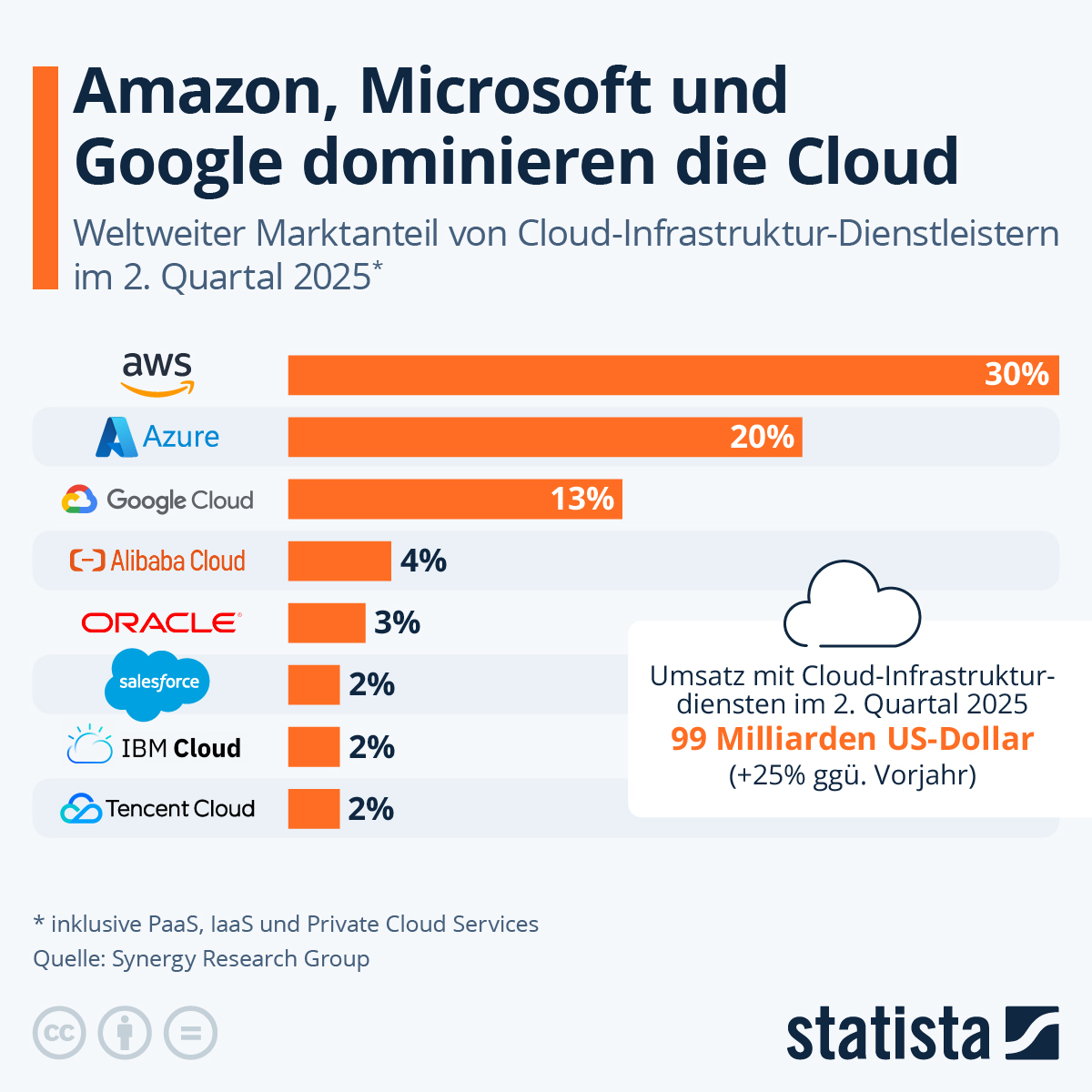 Der Cloud-Infrastruktur-Markt erreichte im zweiten Quartal 2025 ein Volumen von 99 Milliarden US-Dollar für nur drei Monate, was einem Wachstum von 25 Prozent gegenüber dem Vorjahreszeitraum entspricht. Hochgerechnet auf das Gesamtjahr könnte der Markt über 400 Milliarden US-Dollar erreichen.statista