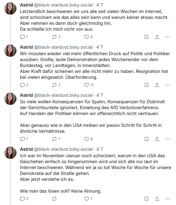 Natürlich, die SPD muss wieder einmal herhalten, um den endgültigen Durchbruch nach rechts aus der Demokratie heraus zu verhindern, nämlich, dass die CDU mit der AfD zusammengeht und längerfristig die AfD die Regierung übernimmt. Manchmal haben wir den Eindruck, es wäre besser, das für eine Zeit auszuhalten, als den Niedergang der ältesten deutschen Partei weiter anschauen zu müssen. Alle links von der Union müssten sich mal in der Opposition erholen können. Dass darin ein gewaltiges Demokratie-Risiko liegt, ist klar, aber wie im Moment kann es nicht weitergehen, denn auch das, was wir jetzt sehen, ist eine große Gefahr für die Demokratie. Und die Zivilgesellschaft ist in weiten Teilen ratlos, hier eine Reaktion auf den obigen Post: