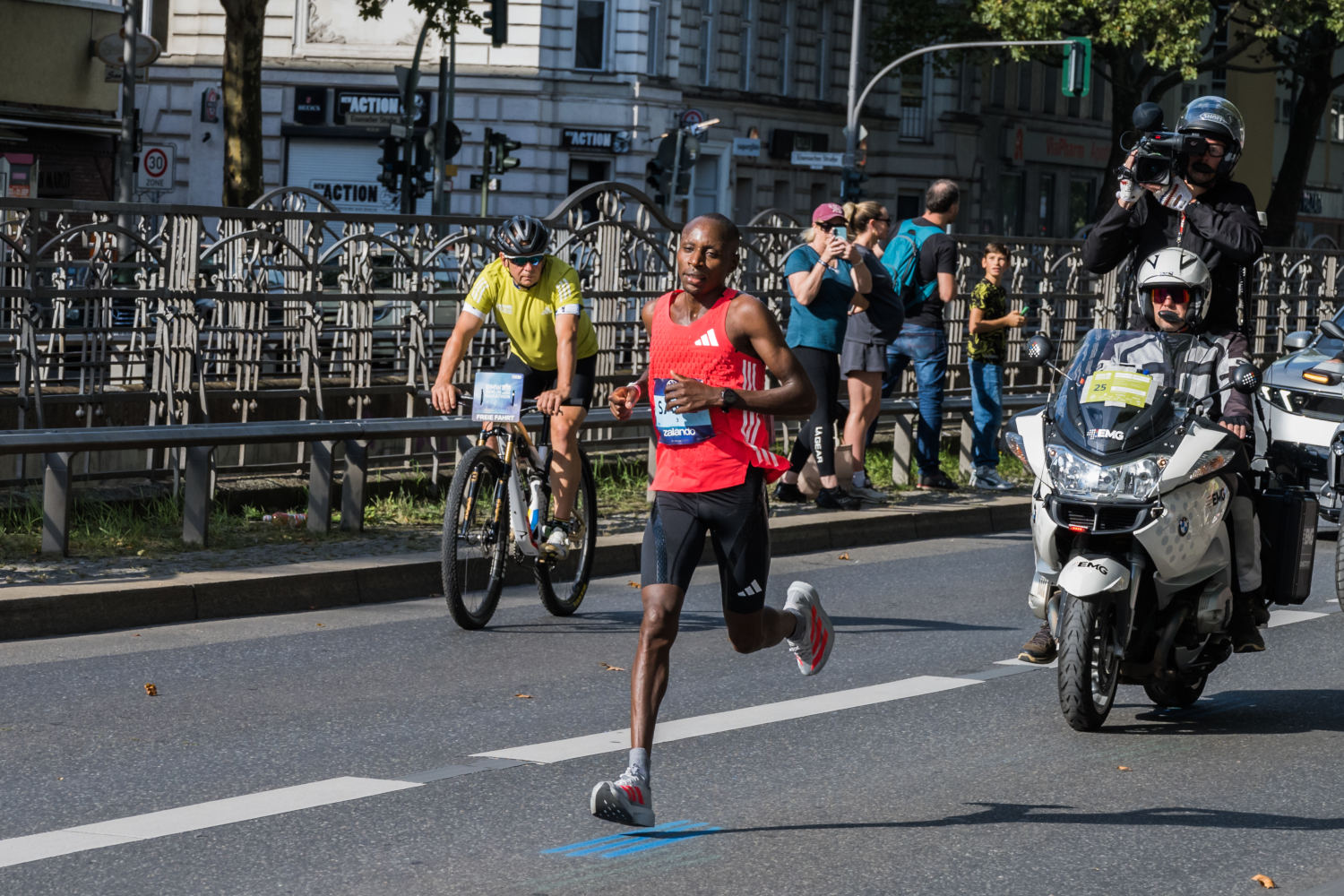 … trafen wir bei Kilometer 22 und dann wieder bei Kilometer 36 auf den späteren Sieger, Sebastian Sawe: