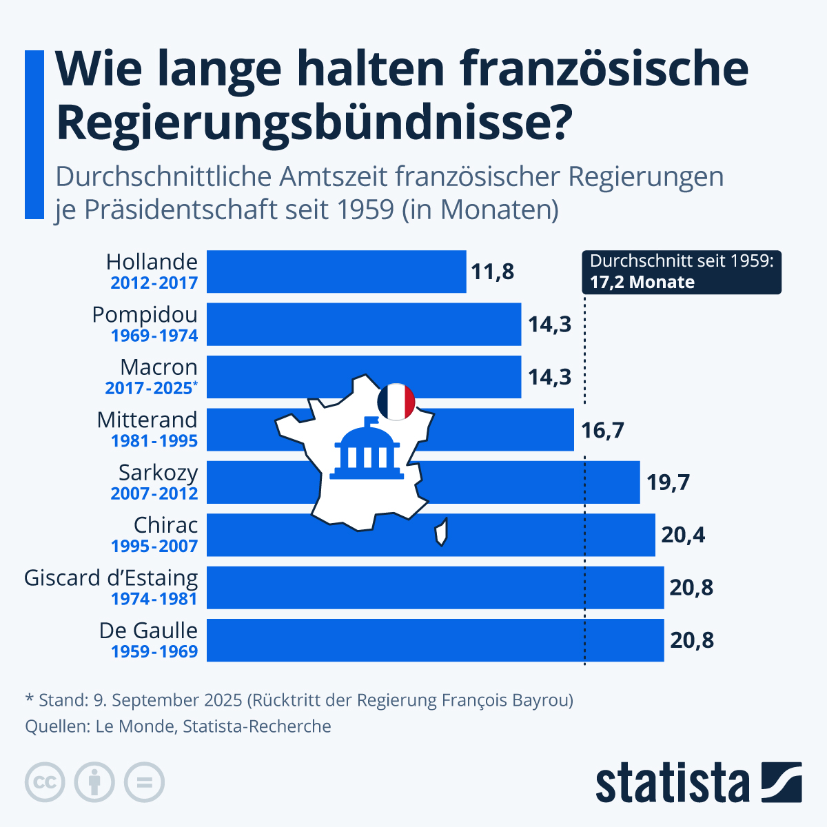 - 8. September 2025 – Misstrauensvotum gegen Premier Bayrou: Das Parlament stimmte gegen die Regierung Bayrou; er trat zurück, was die politische Zerbrechlichkeit des Regierungsbündnisses offenlegte. (Reuters)