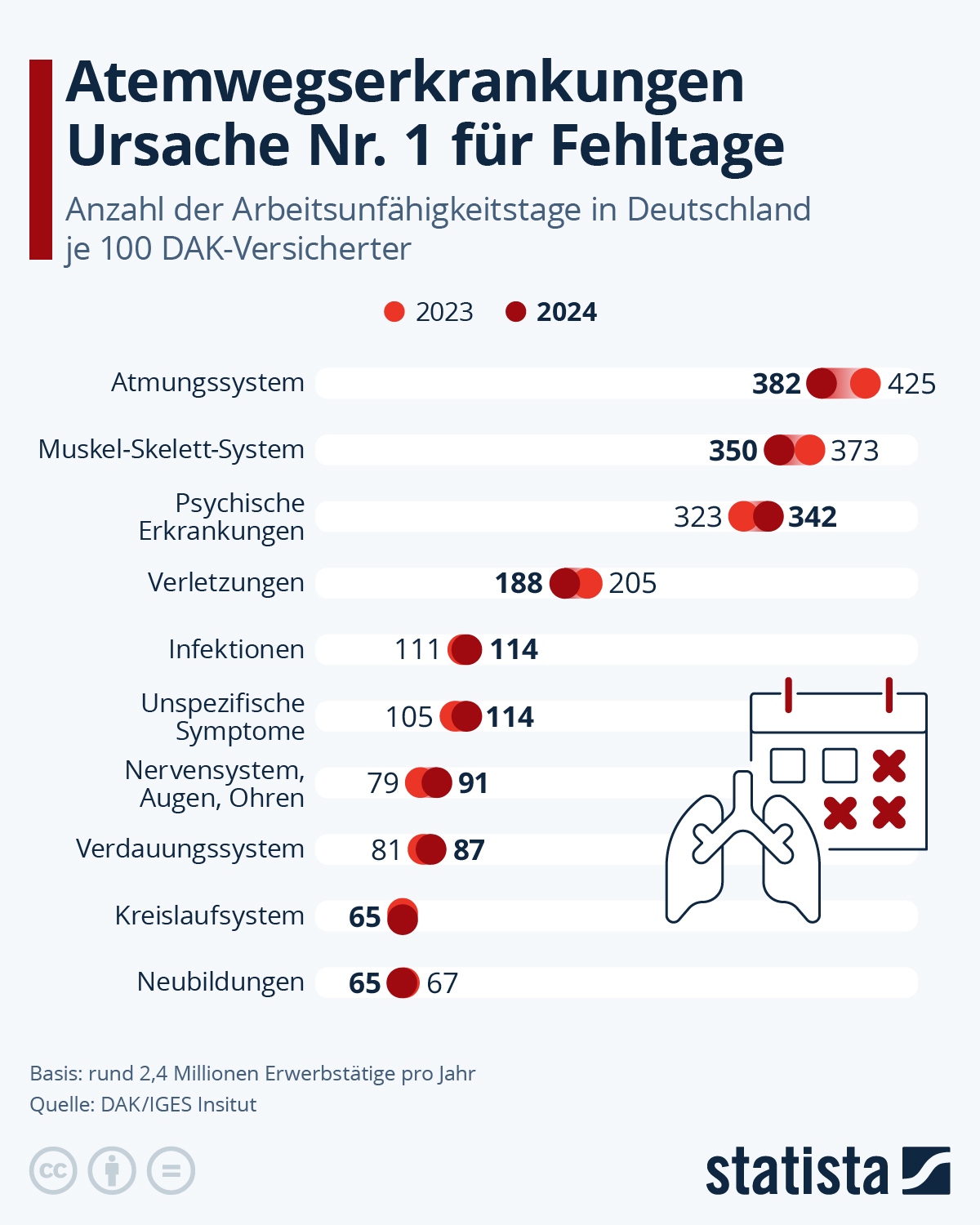 Atemwegserkrankungen: 22,4 % der Fehltage, ~ 4,28 Tage pro Person. (Die Techniker)