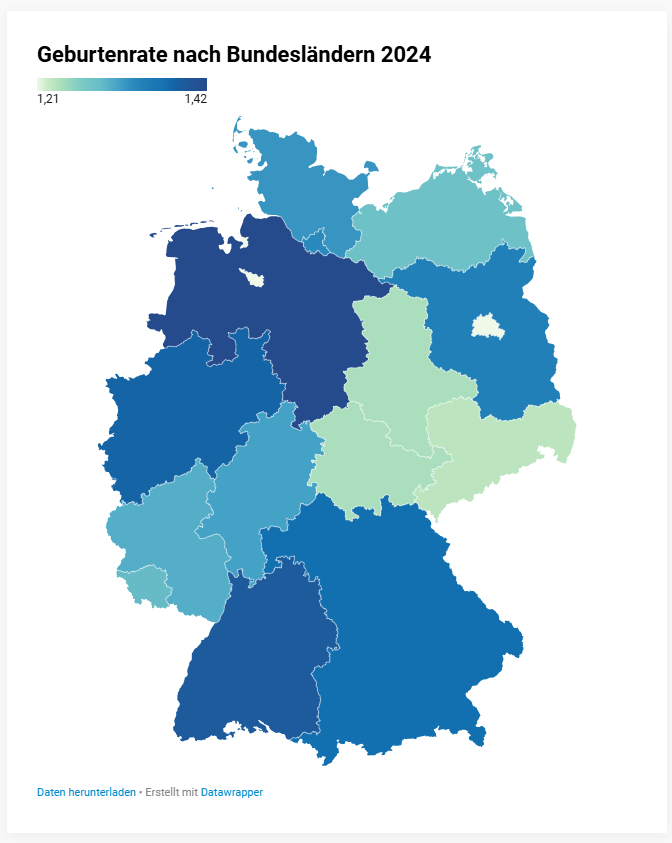 Vielleicht begann die Tendenz, über die wir gleich berichten werden, gar nicht erst 2024, aber sie weist aus, dass sich auch die Geburtenraten-Landkarte nun dem üblichen Ost-West-Schema angepasst hat: