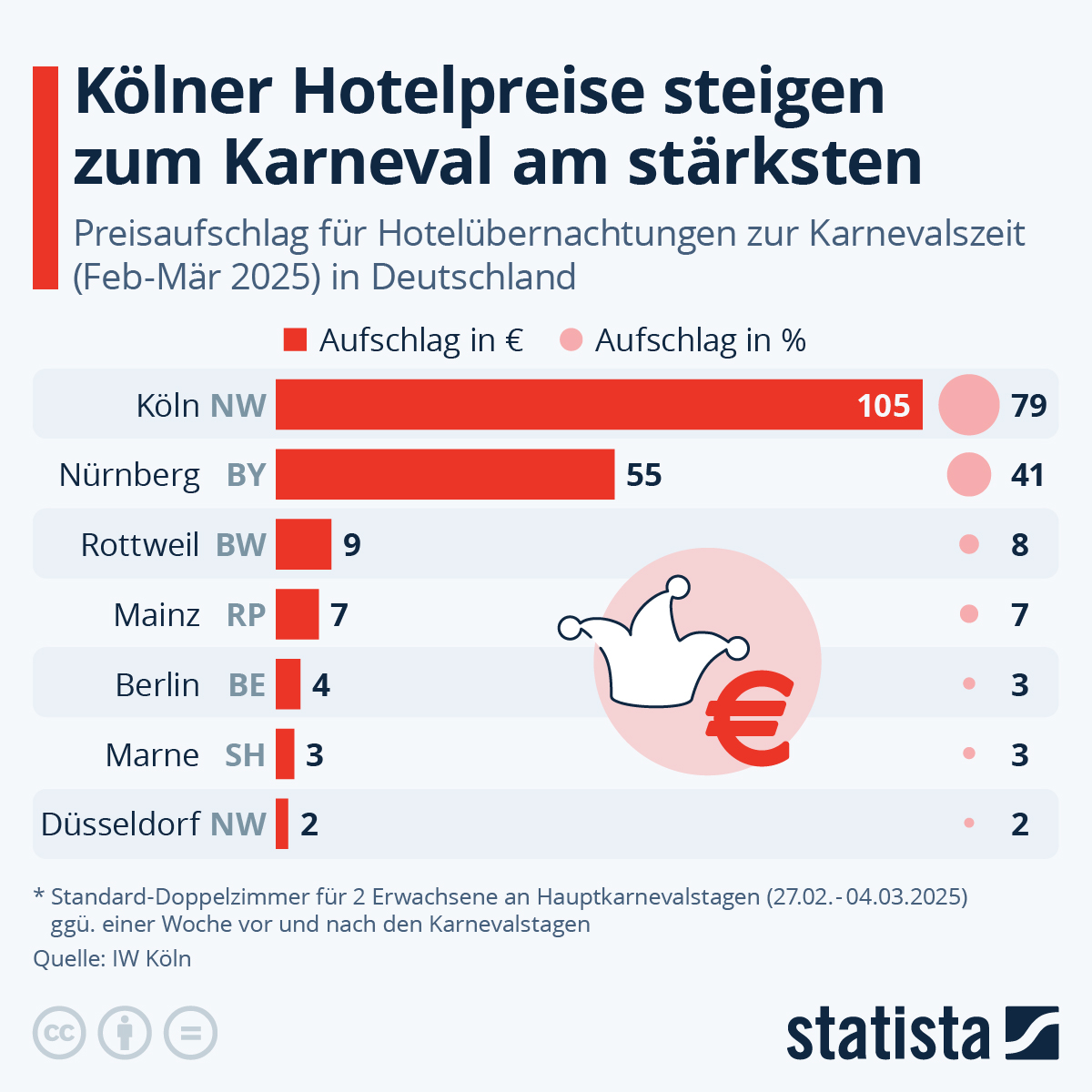 Infografik: Wo steigen Hotelpreise während des Karnevals besonders stark? | Statista