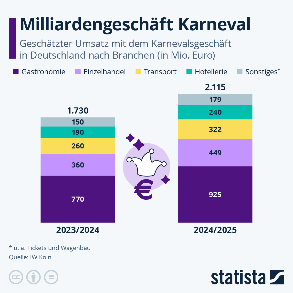 Heute beginnt die neue Karnevalsaison. Bis zum Aschermittwoch, ihrem traditionellen Ende, sind es noch 99 Tage. Genug Zeit für alle Jecken, um an Veranstaltungen teilzunehmen und Geld auszugeben – und das tun sie reichlich, wie die Statista-Infografik auf Basis einer Schätzung des Informationsdienstes des Instituts der deutschen Wirtschaft (iwd) zeigt. In der vergangenen Saison 2024/2025 hat der Karneval demzufolge bundesweit rund 2,1 Milliarden Euro in die Kassen gespült – und damit deutlich mehr als in der vorangegangenen Saison der Jahre 2023/2024. Den starken Anstieg führen die Experten vor allem auf die mit 115 Tagen besonders lange letzte Karnevalssaison zurück.