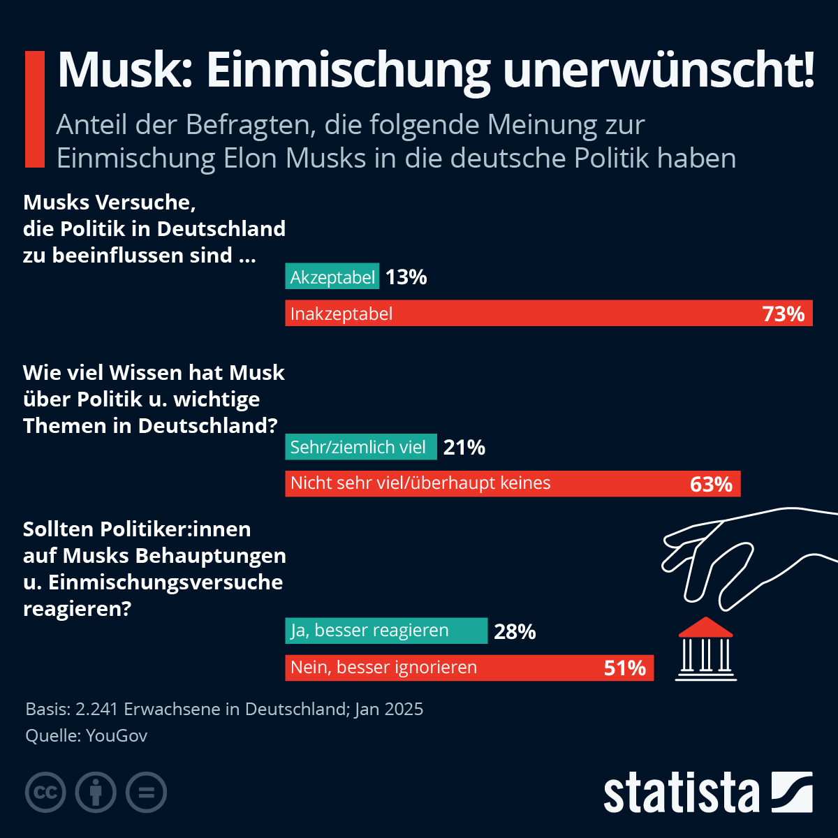 Laut einer YouGov-Umfrage (Januar 2025) halten 71 % der Deutschen Musks politische Einflussversuche für inakzeptabel.