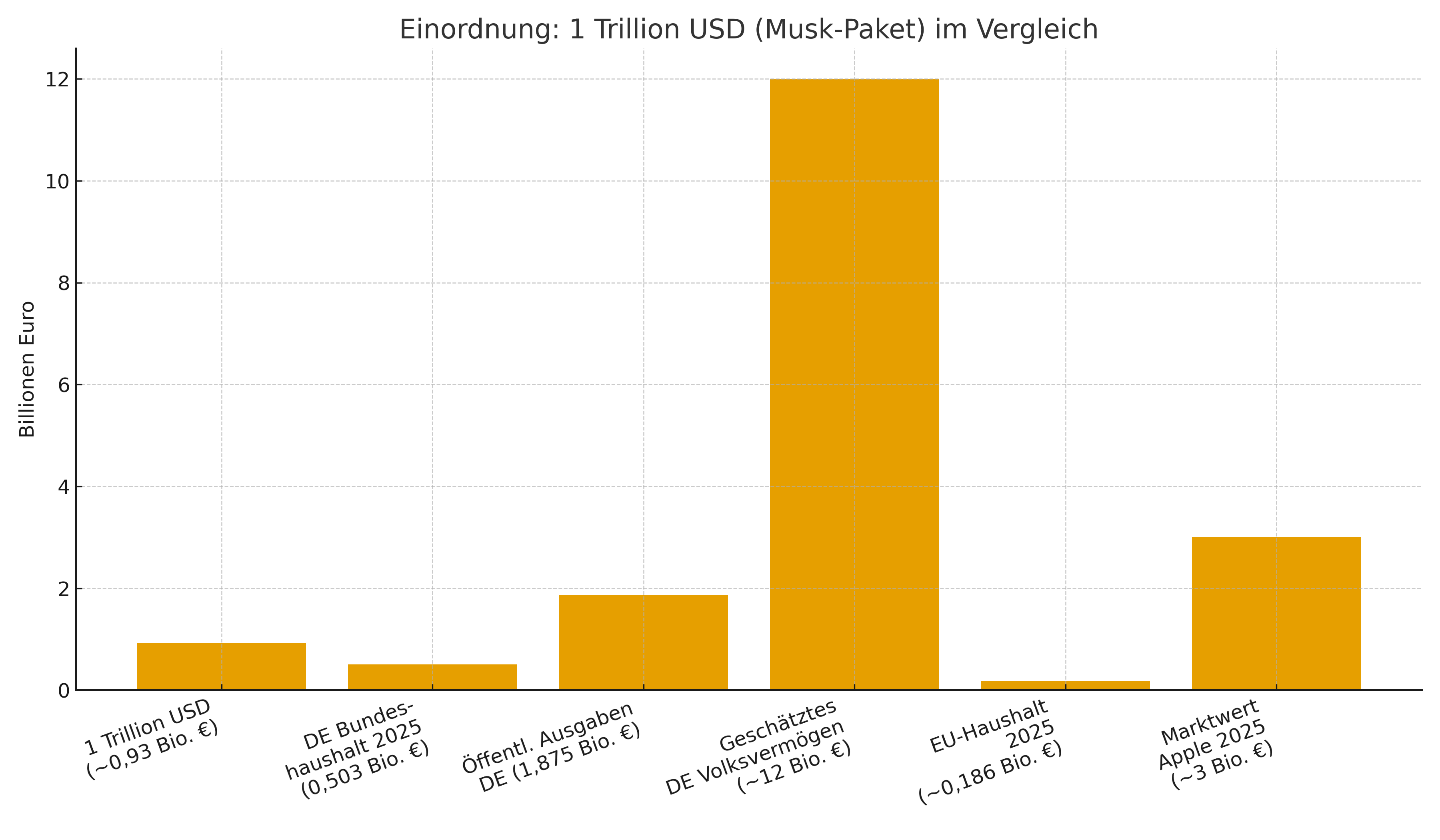 Für die Durchschnittsbevölkerung: Wenn man bedenkt, dass eine Billion US-Dollar (≈ 930 Mrd €) allein ca. 7,5 % des deutschen Volksvermögens sein könnten (Ihre Angabe) oder dem Bundeshaushalt von zwei Jahren entsprechen – dann entsteht der Eindruck einer enormen Ungleichheit und einer demokratischen Disproportionalität: eine einzige Person mit Vermögen, das ganze Funktionsbereiche des Staates übersteigt.
