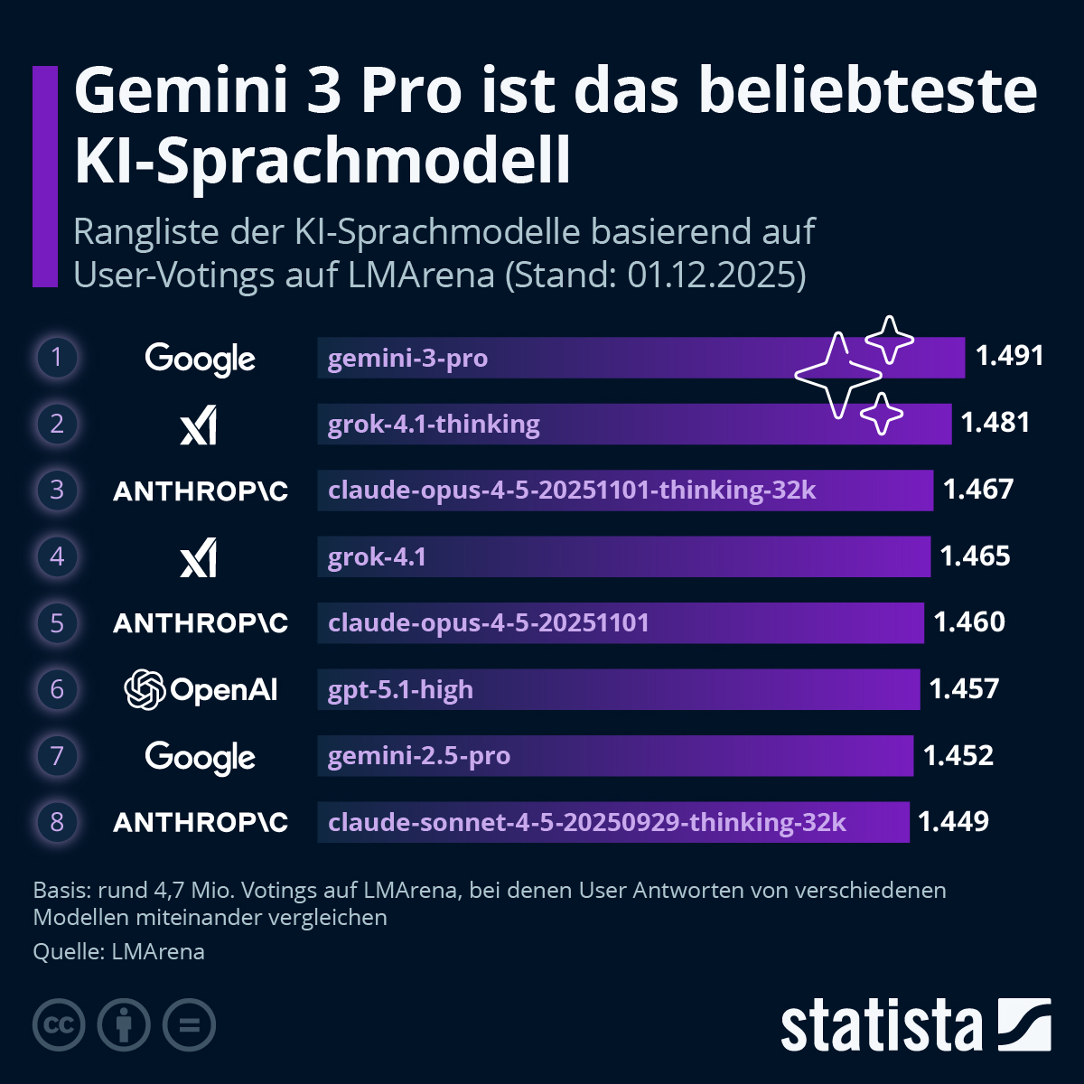 Googles Gemini 3 Pro ist bei KI-Sprachmodellen derzeit bei Nutzenden dieser Technologie weltweit am beliebtesten. Das zeigt eine Rangliste der Plattform LMArena, auf der große KI‑Sprachmodelle (Large Language Models, kurz LLMs) durch Gemeinschaftsvoting bewertet werden. Hierbei vergleichen Nutzende paarweise die Antworten zweier KI-Modelle und wählen aus, welche Antwort besser ist. Die Rangliste der beliebtesten Sprachmodelle basiert Anfang Dezember 2025 auf über 4,7 Millionen Votings und wird dabei laufend aktualisiert.