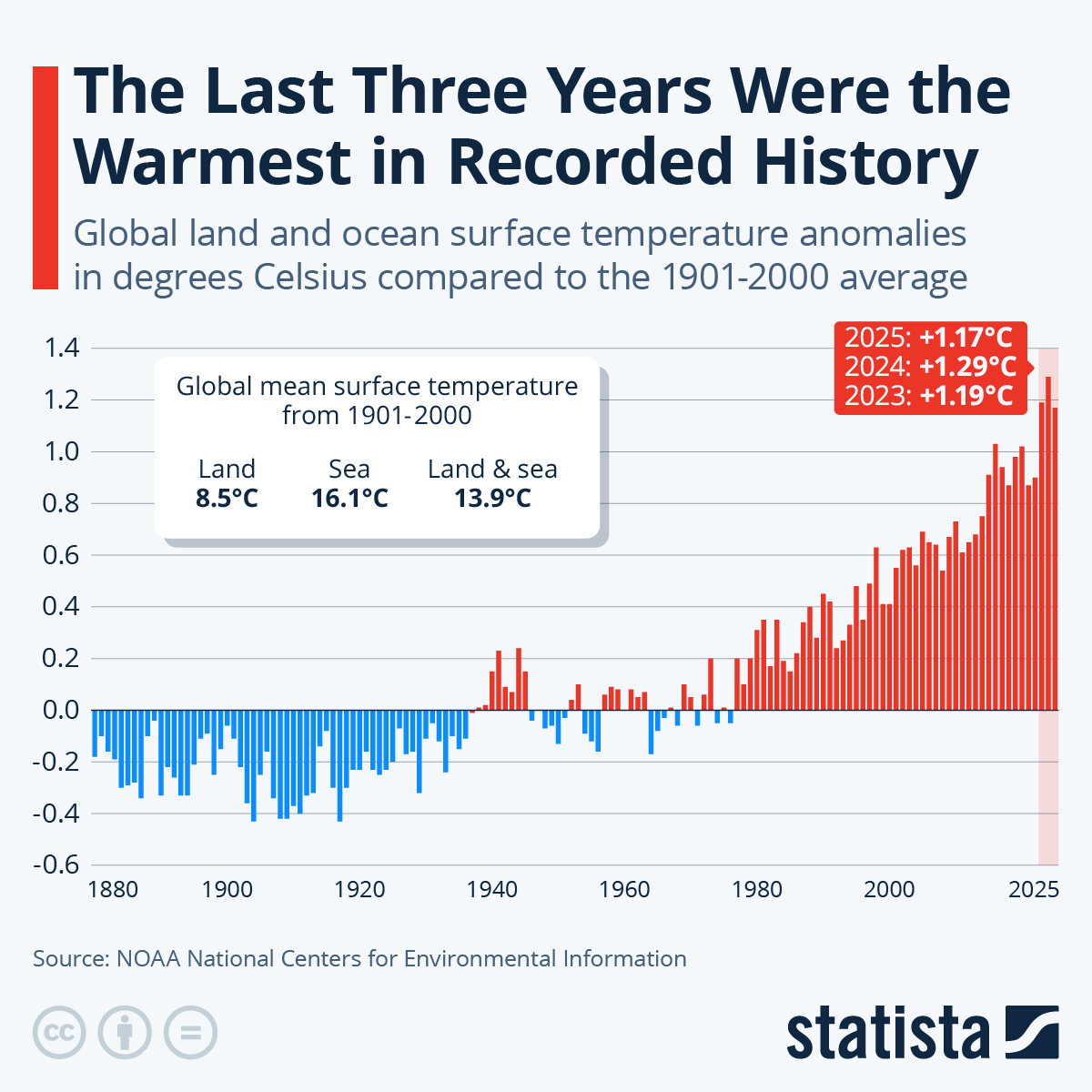 Die National Oceanic and Atmospheric Administration (NOAA) sowie andere internationale Klimaforschungsinstitute gaben diese Woche bekannt, dass 2025 das drittwärmste Jahr seit 1850 war, nur noch 2023 und 2024. Die durchschnittliche Land- und Meeresoberflächentemperatur der Erde lag im Jahr 2025 bei 1,17 Grad Celsius (2,11 Grad Fahrenheit) über dem Durchschnitt des 20. Jahrhunderts von 13,9°C (57,0°F). Dieser Wert verfehlte knapp den derzeit 2023 gehaltenen zweiten Platz (+1,19°C) und lag hinter dem Rekord von 2024 (+1,29°C).
