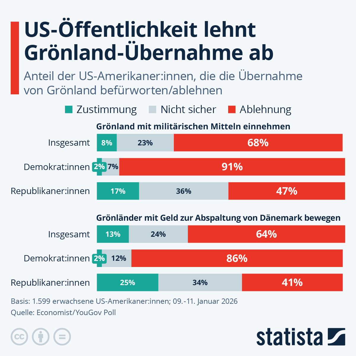 Die aktuelle Statista-Infografik (Stand 20. Januar 2026) basiert auf einer Umfrage von YouGov im Auftrag des Economist. Die Kernaussage ist eindeutig: Die US-Öffentlichkeit steht Trumps Annexionsplänen extrem skeptisch gegenüber.
