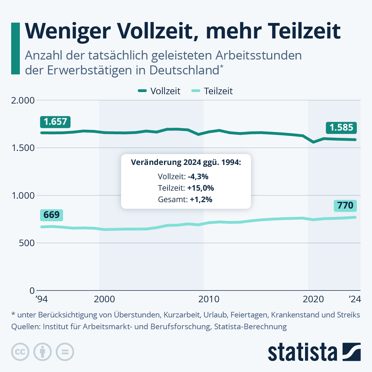 Gleichzeitig lässt sich aber auch beobachten, dass die jährlichen Arbeitsstunden von Vollzeitbeschäftigten leicht rückläufig sind, während die Teilzeit-Arbeitsstunden in höherem Maße zugenommen haben. Das zeigt die Statista-Infografik . Der Anteil von Teilzeit-Arbeitsstunden ist dabei von 28,8 Prozent im Jahr 1994 auf 33,7 Prozent im Jahr 2024 angestiegen. Es gibt also einen Trend hin zu mehr Teilzeitarbeit. Arbeiten die Deutschen deswegen insgesamt weniger? Das lässt sich aus den Daten nicht ableiten, denn die Summe aller in Voll- und Teilzeit geleisteten Arbeitsstunden ist über den genannten Zeitraum fast gleich geblieben, beziehungsweise nur leicht gestiegen (+1,2 Prozent).