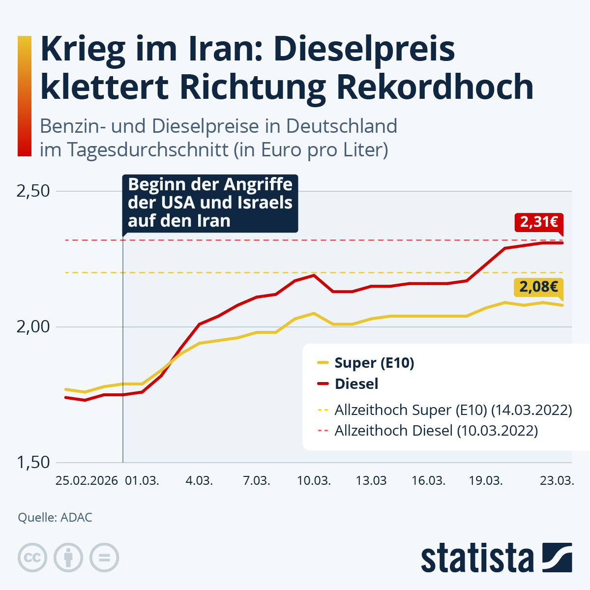 Wie extrem die aktuellen Preise sind, zeigt ein Blick auf die Allzeithochs von Diesel und Benzin vor dem Ukraine-Krieg. Bis 2022 lag das Allzeit-Tageshoch für Diesel bei 1,572 Euro (14.11.2021). Der Höchstwert für Super E10 lag bei 1,709 Euro (13.09.2012).