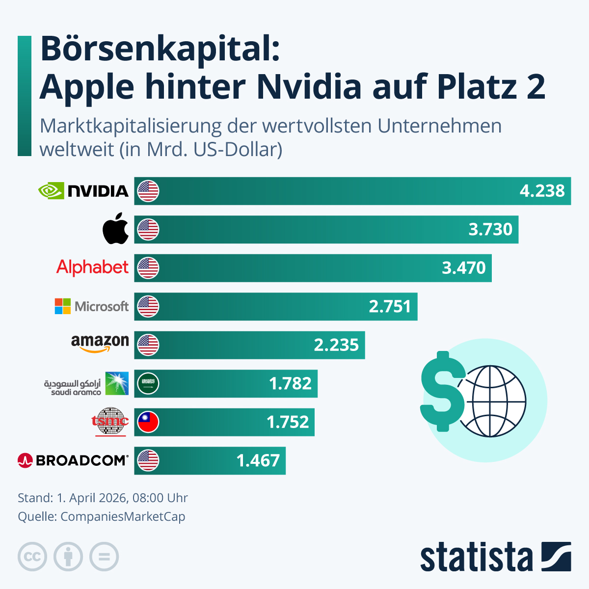 Der Begleittext nennt konkret Nvidia als aktuell wertvollstes Unternehmen mit einer Marktkapitalisierung von über vier Billionen US‑Dollar und Apple als Nummer zwei mit rund 3,7 Billionen US‑Dollar.statista