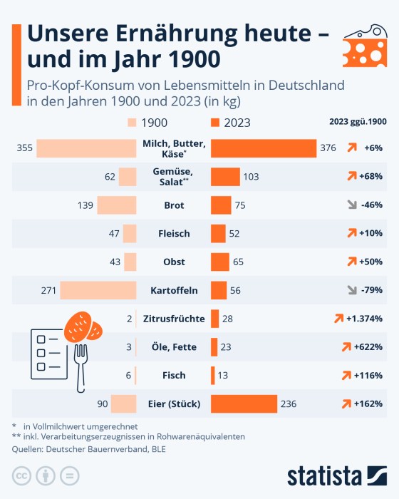 Wie unterscheidet sich unsere heutige Ernährung von jener im Jahr 1900? (Statista + Kurzkommentar)
